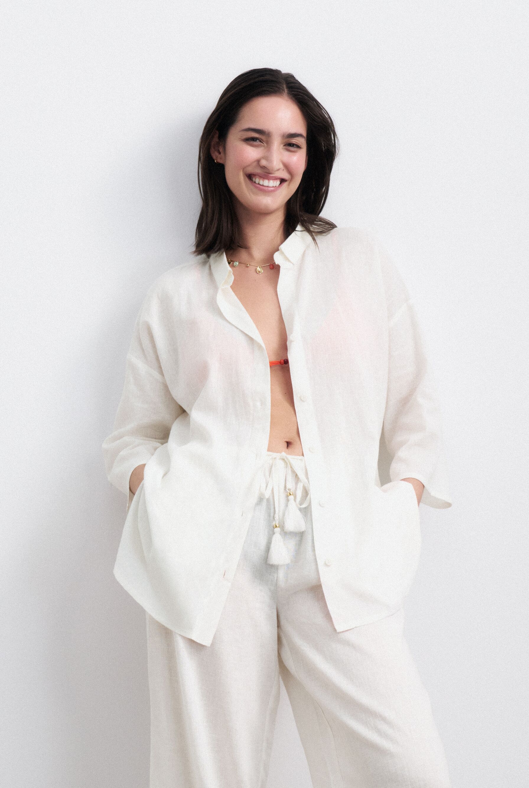 A na sam koniec – stylowa kropka nad „i”. Do bieliźnianych modeli w odcieniu zarówno Cloud Dancer, jak i Icy Blue świetnie pasują lekkie elementy homewear z kolekcji Triumph Summer Wear. Koszula typu boyfriend, luźne spodnie czy szorty w odcieniu Silk White tworzą naturalne przedłużenie minimalistycznej estetyki sezonu. Narzucone na bieliznę budują look pełen lekkości i wakacyjnej swobody – dokładnie taki, jaki kochają fashionistki.