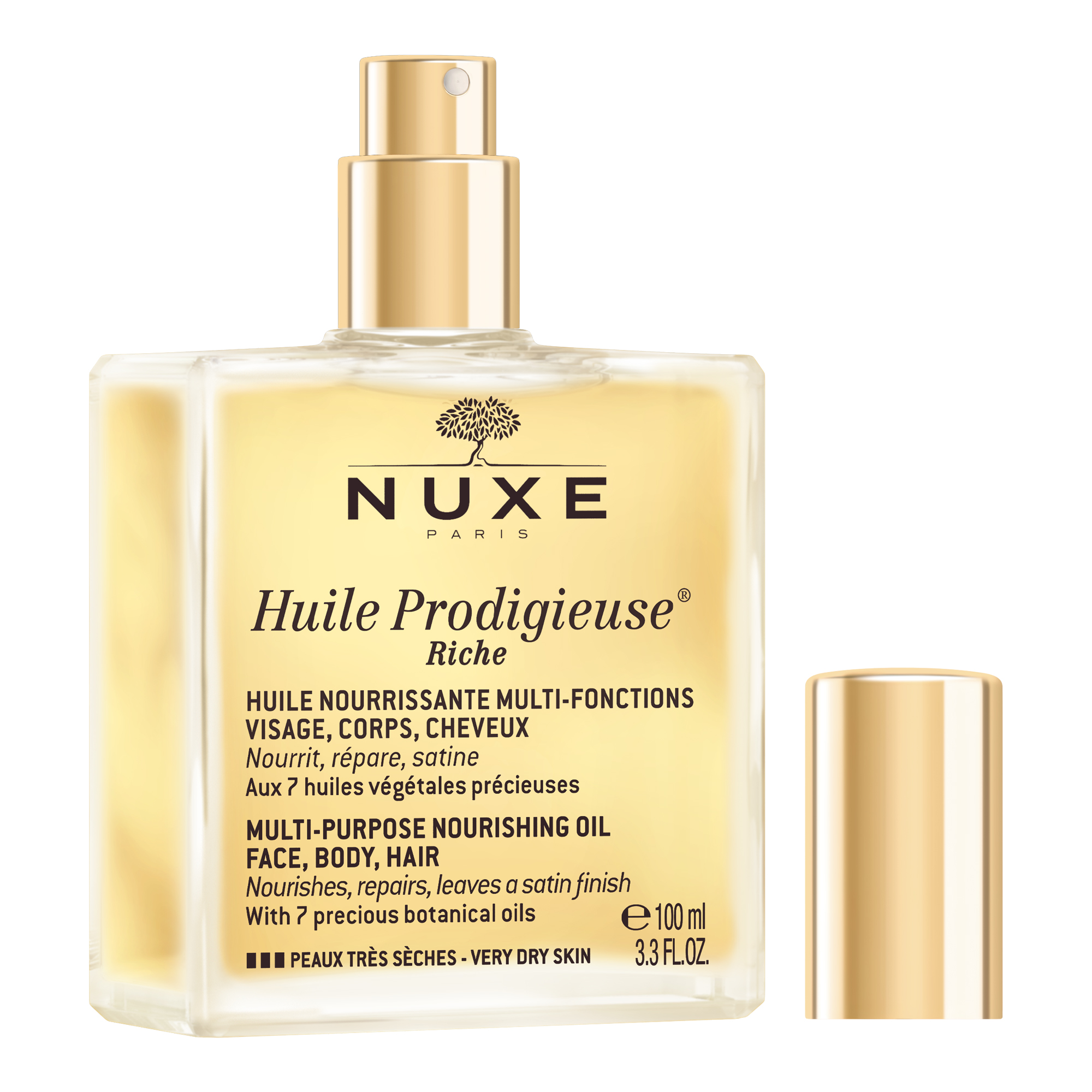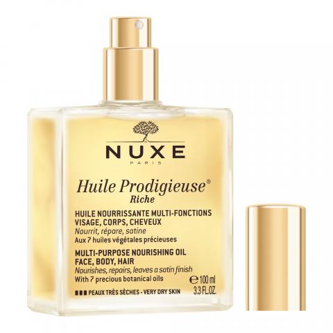 Odżywcza satynowa pielęgnacja dla bardzo suchej skóry (będącej wynikiem naturalnej kondycji skóry lub sezonową przypadłością). Formuła Huile Prodigieuse® Riche, zawiera potężny antyoksydant - witaminę E, w dalszym ciągu pozostaje naturalna (98% organicznych składników naturalnych). Nie zawiera olejów mineralnych, konserwantów, ani silikonów.